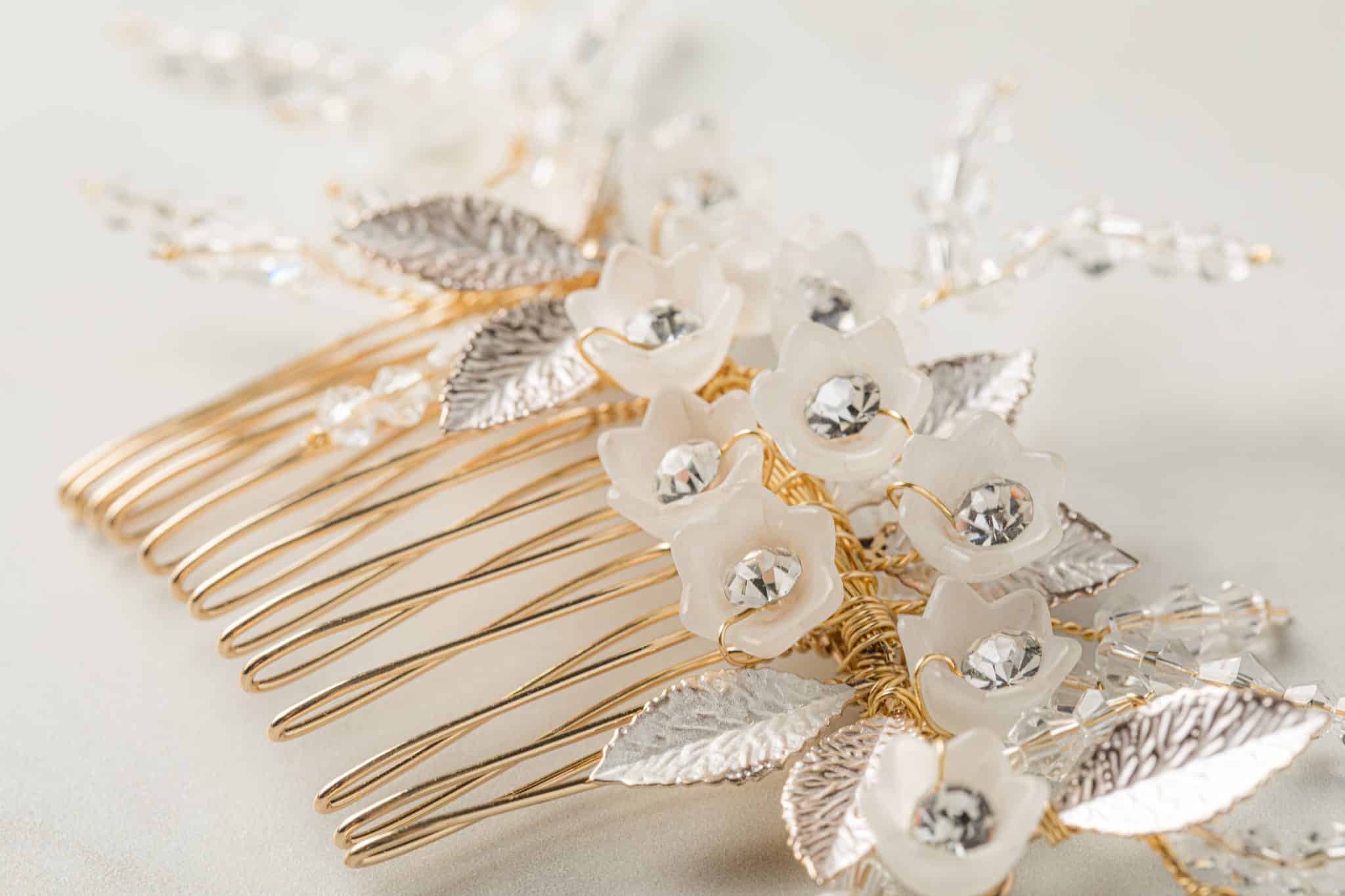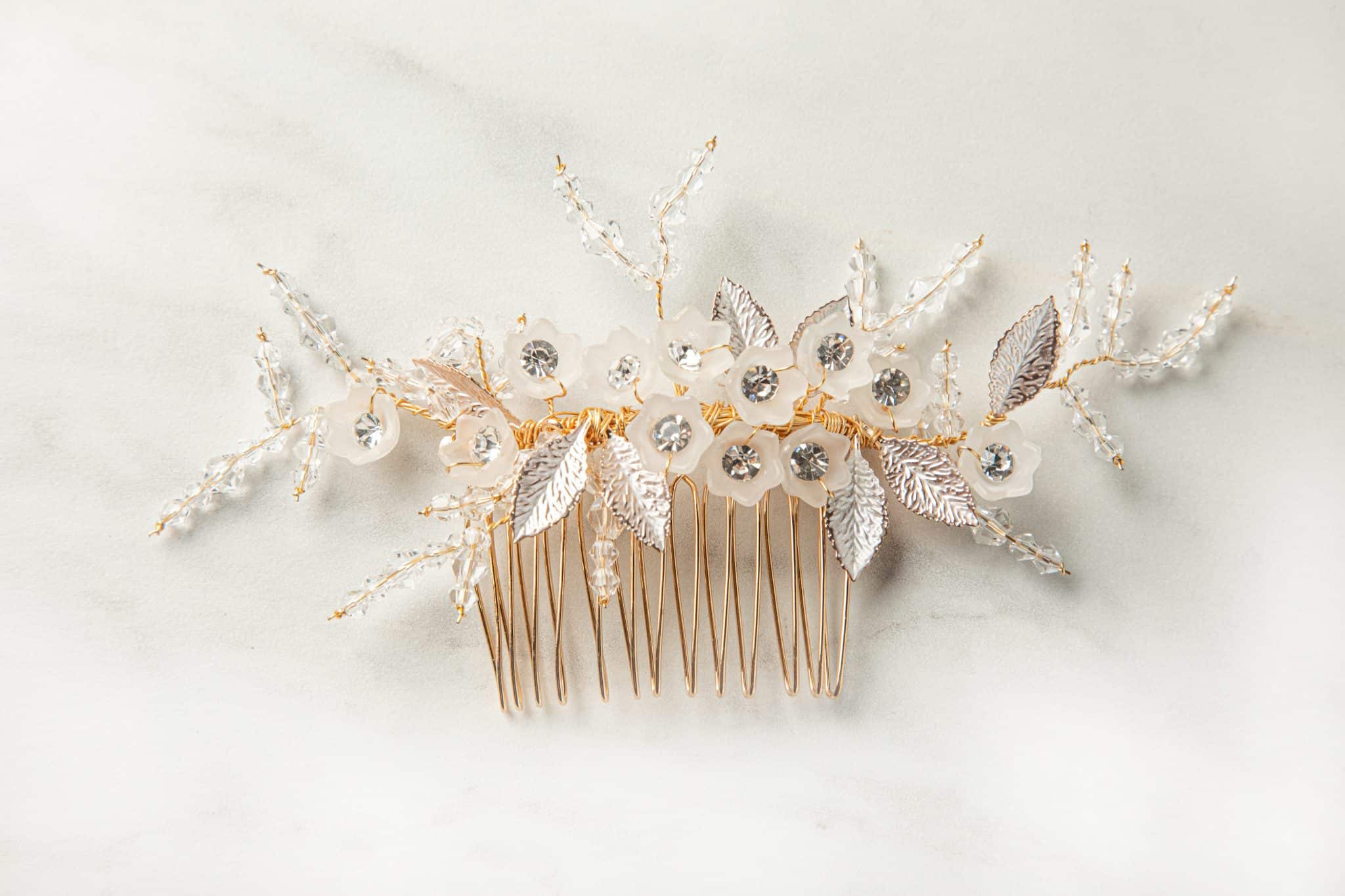 De unieke Carlotta haarkam van SallyJaneBridal is een prachtig accessoire voor de moderne, romantische bruid. De haarkam is gemaakt met kristal, zilverkleurige blaadjes en doorzichtige bloemetjes met bergkristal.Â