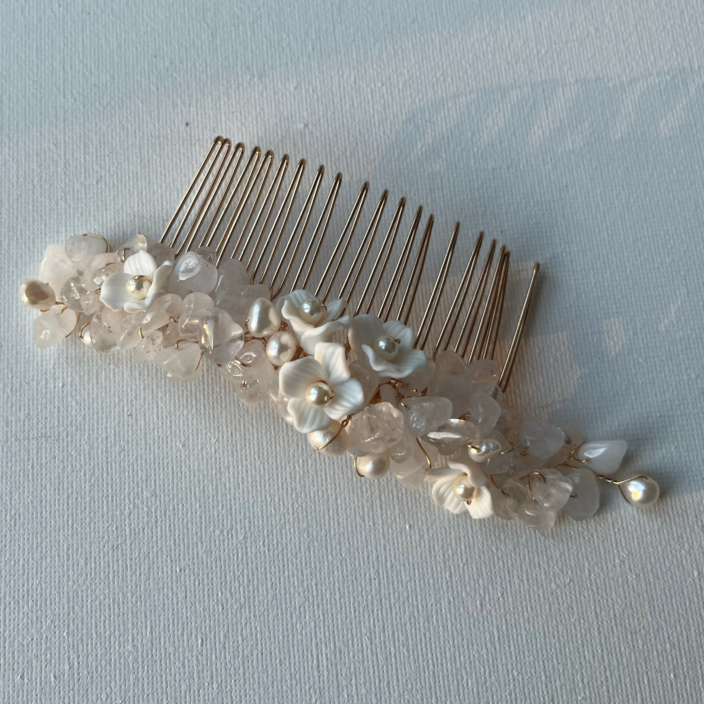 De zachte kleur van de doorzichtige edelstenen van de Celeste Haircomb Silver passen bij elke bruidslook en geven een romantische, bohemian finishing touch aan je bruidskapsel.