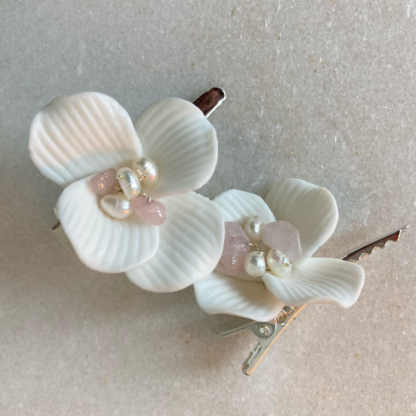De mooie romantische haaraccessoires (set van 2) van SallyJaneBridal zijn gemaakt van keramische subtiele bloemen afgewerkt met een paar rozenkwartssteentjes en kleine pareltjes. De haarsieraden zijn uniek en geven je bruidskapsel de perfecte afwerking voor een romantische look.
