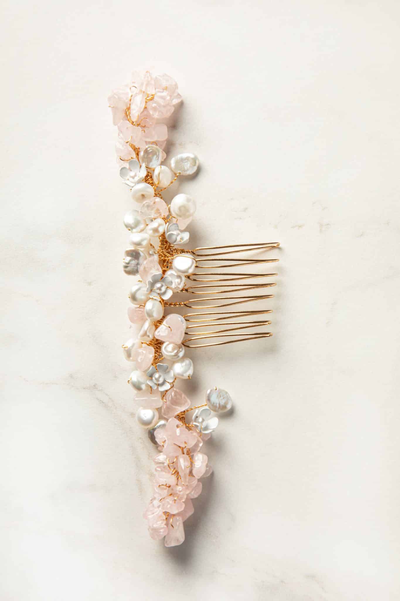 Dankzij de zachtroze rozenkwarts steentjes, parels en subtiele bloemetjes is deze haarkam van SallyJaneBridal perfect voor de bohemian bruid. De basis van de Gaia kam is gemaakt van goudkleurig messing. Met deze natuurlijke elementen is de Gaia bruids haarkam perfect voor een romantische bruiloft in de buitenlucht.