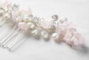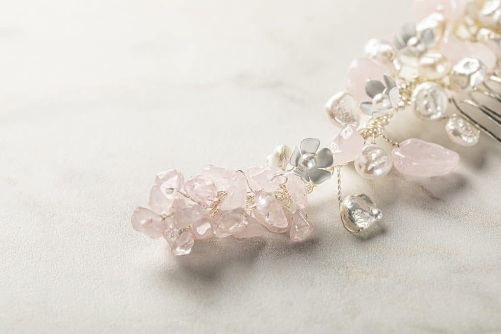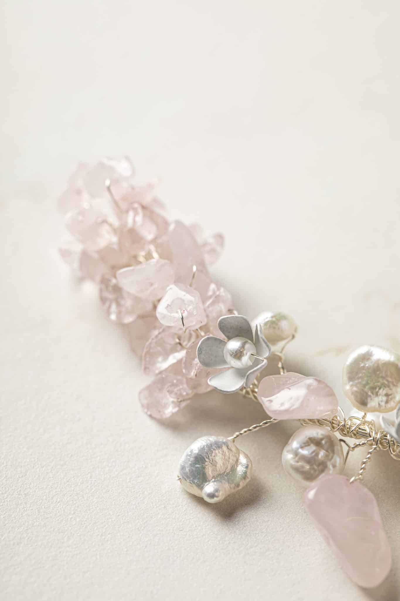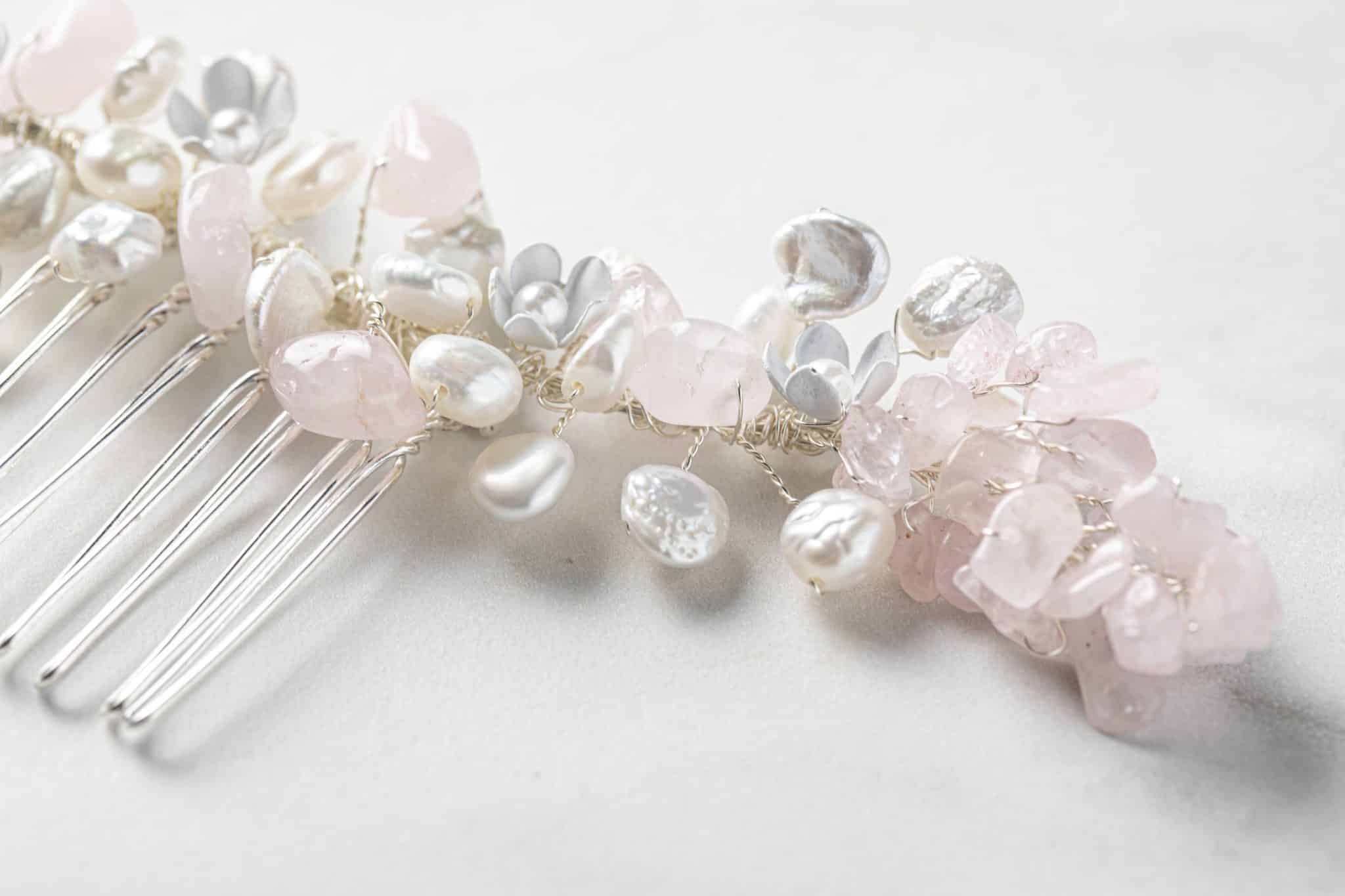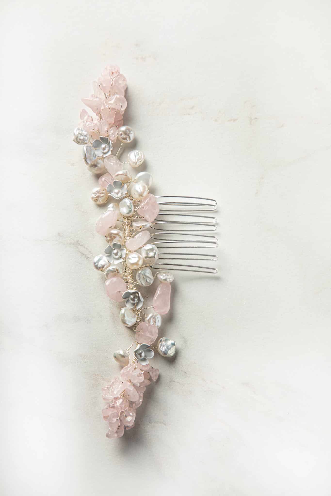 Dankzij de zachtroze rozenkwarts steentjes, parels en subtiele bloemetjes is deze bohemian haarkam van SallyJaneBridal perfect voor de bohemian bruid. De basis van de Gaia Haircomb Silver is gemaakt van zilverkleurig messing. Met deze natuurlijke elementen is de bohemian haarkam Gaia perfect voor een romantische bruiloft in de buitenlucht.