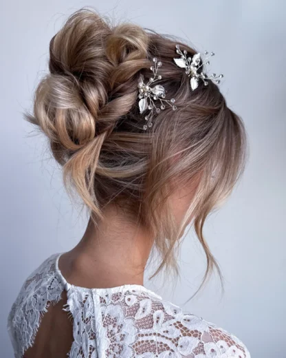 De zilverkleurige bladeren zijn afgewerkt met zoetwaterparels & bergkristal, wat ze een elegante en klassieke uitstraling geven. Dankzij de combinatie van luxe materialen en organische vormen past de Hera haaraccessoires perfect bij een klassieke bohemian bruidslook!
