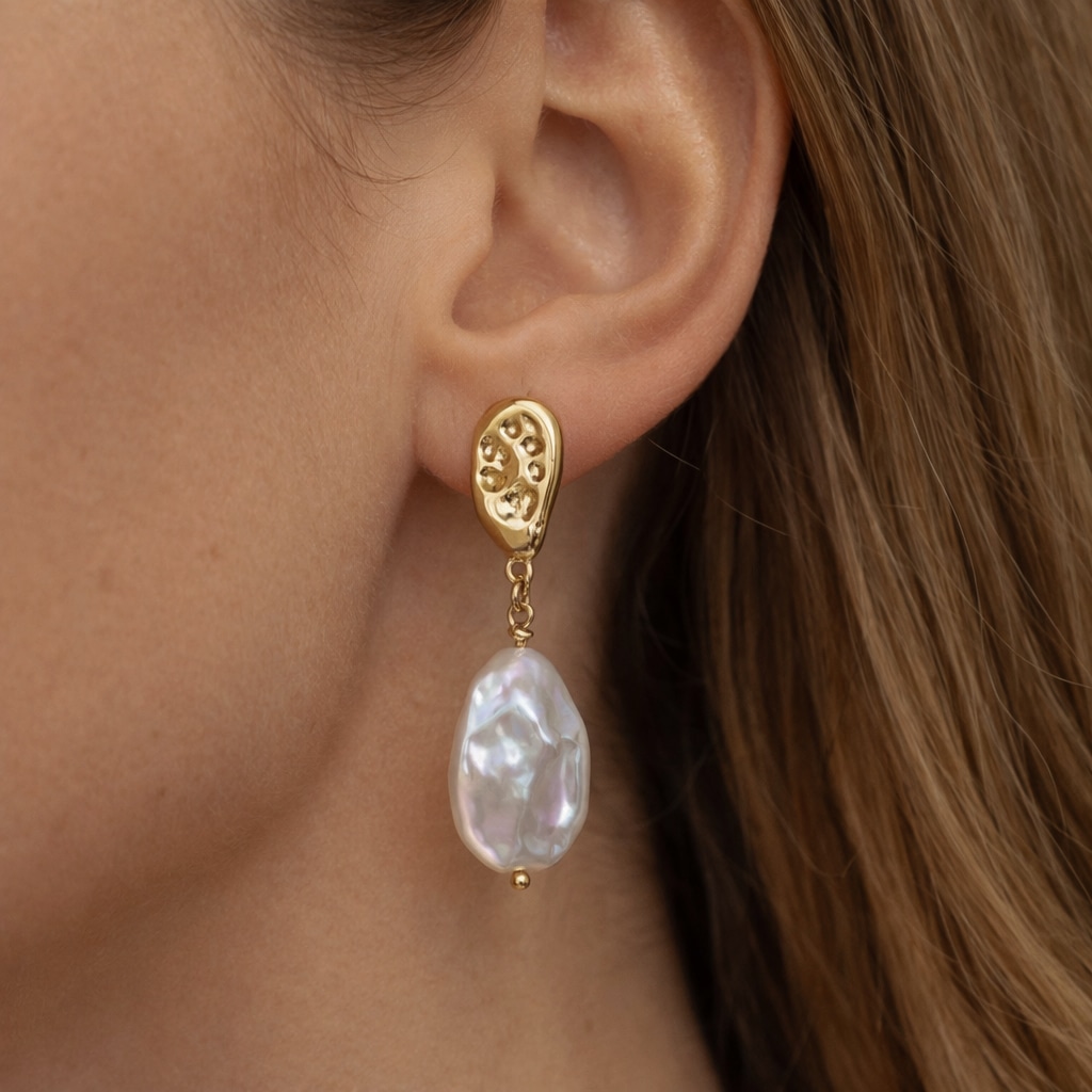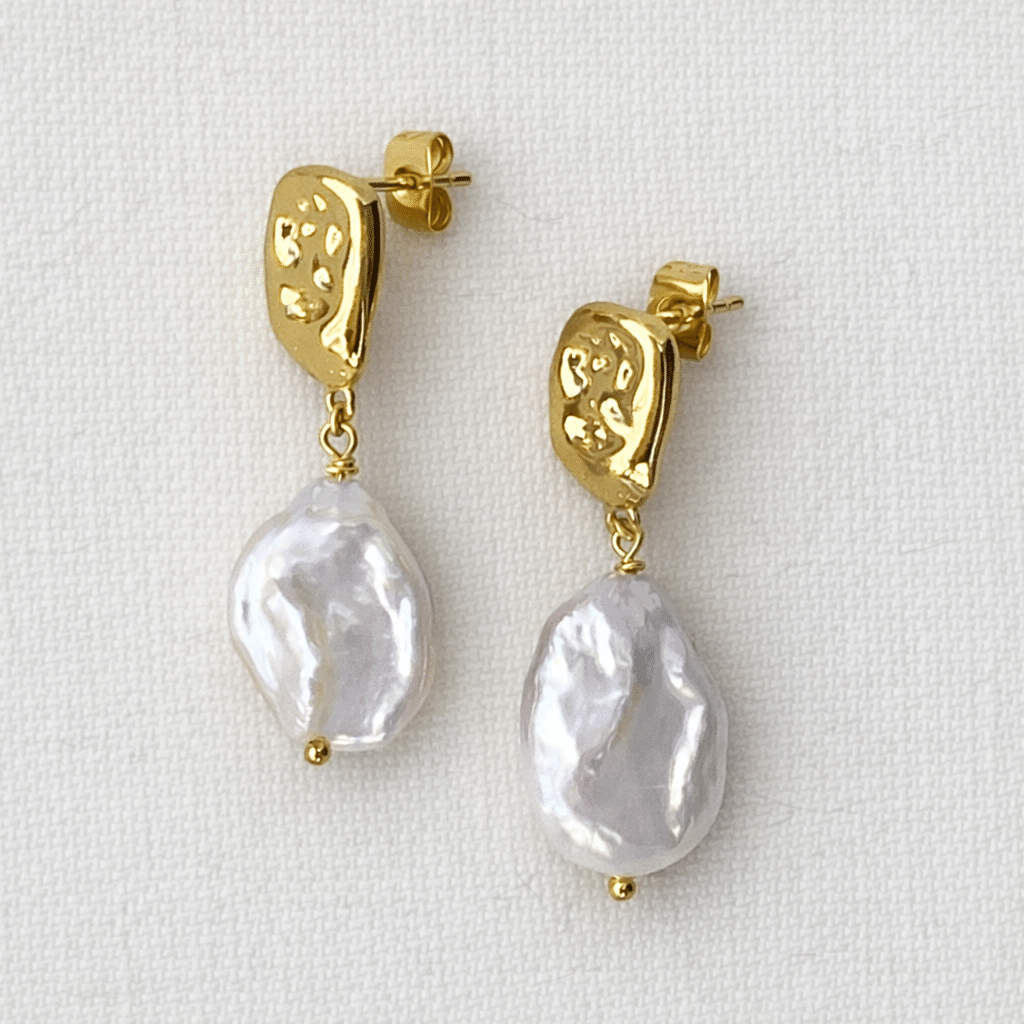 Deze Isla Earrings Gold is geen standaard pareloorbellen. De combinatie van het organisch gevormde gouden element en de vrije, bijna vloeiende vorm van de barokparel geeft haar een moderne maar zachte uitstraling. Ze voelt verfijnd, maar niet braaf. Elegant, maar met karakter.