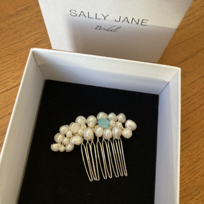 Deze subtiele haaraccessoire is geïnspireerd op “Something Blue”, zoetwaterparels gemixt met 1 klein blauw edelsteentje. Door de zachte tint past dit haarsieraad prachtig bij elke trouwjurk!
