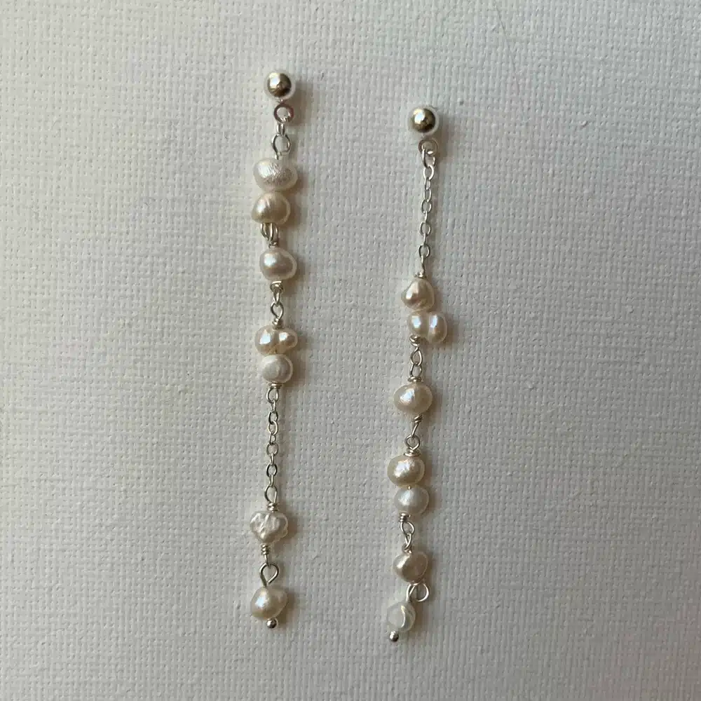 Stijlvolle silver-plated oorbellen over messing, verfijnd afgewerkt met schitterende zoetwaterparels. Deze lange Mila oorbellen stralen elegantie uit en zijn perfect voor speciale gelegenheden of als subtiele statement-piece. Ook verkrijgbaar in goud. Lengte: 7.5 cm