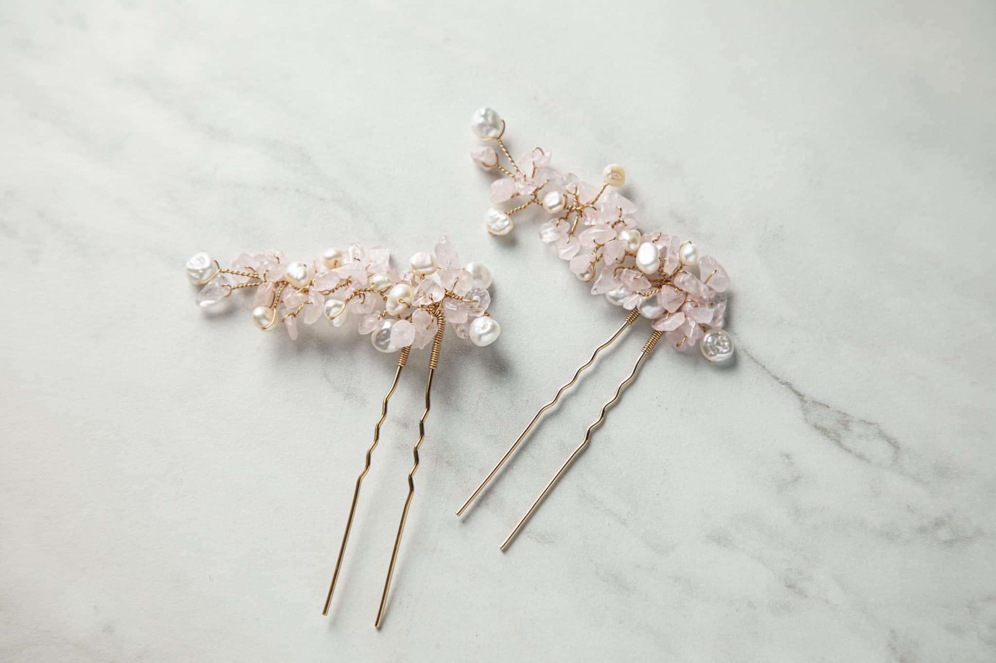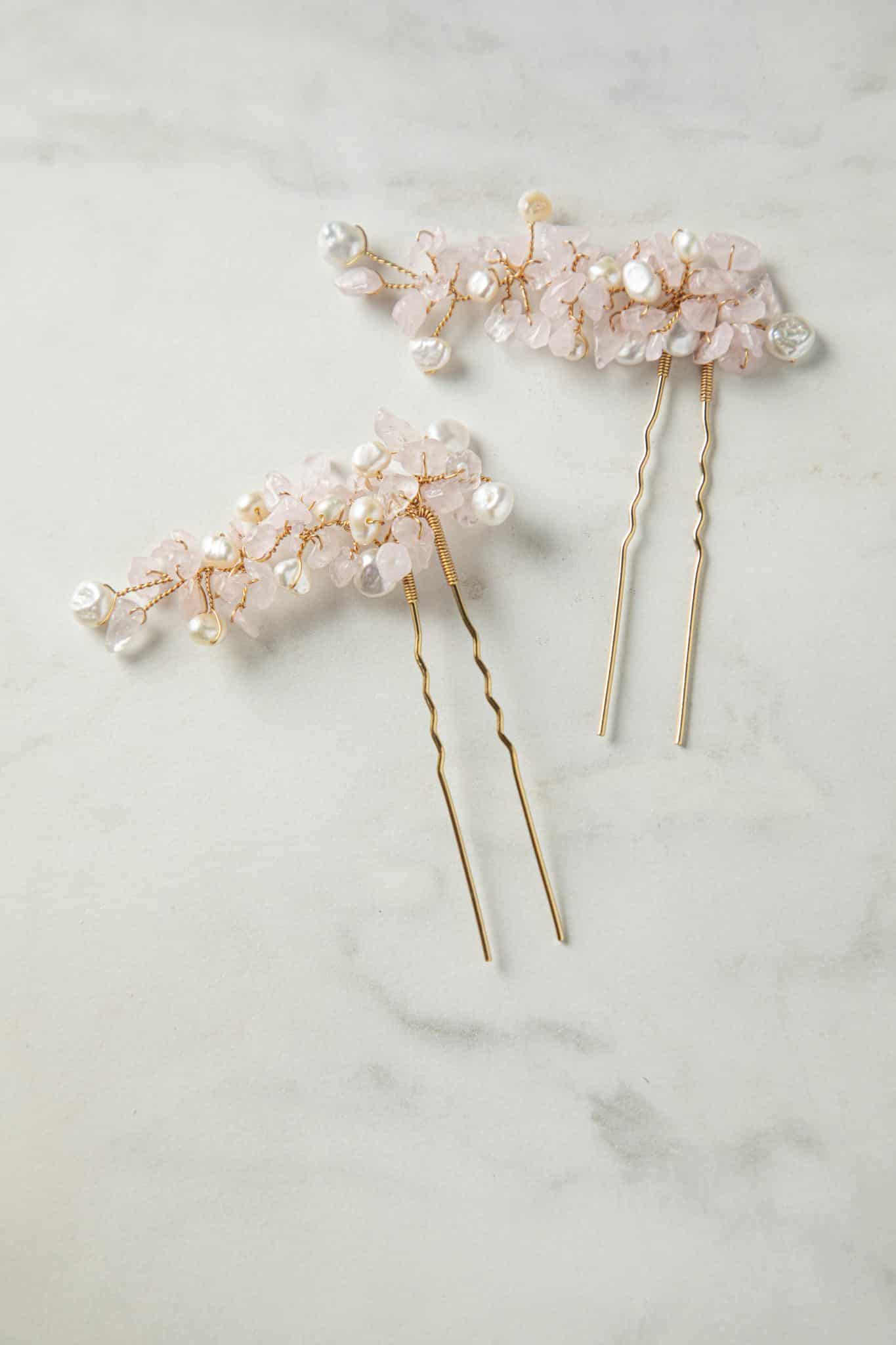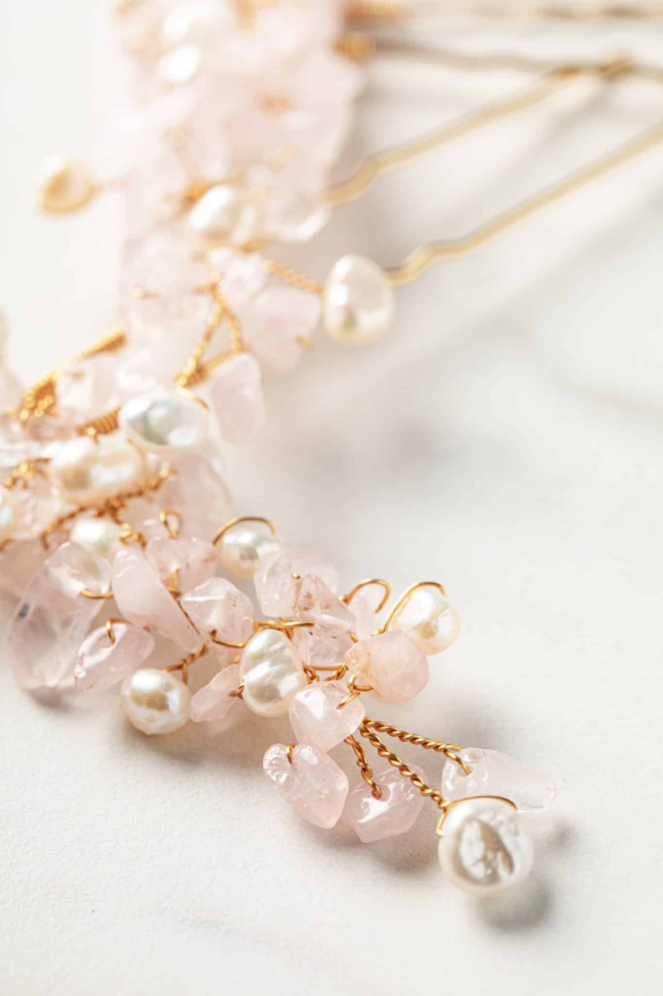 De zachtroze kleur van de edelstenen van de liefde doet denken aan de momenten voordat de zon s’avonds de zee in zakt, wanneer de lucht prachtig roze kleurt. Deze unieke “lovestone” accessoires geven je bruidskapsel een elegante bohemian touch.