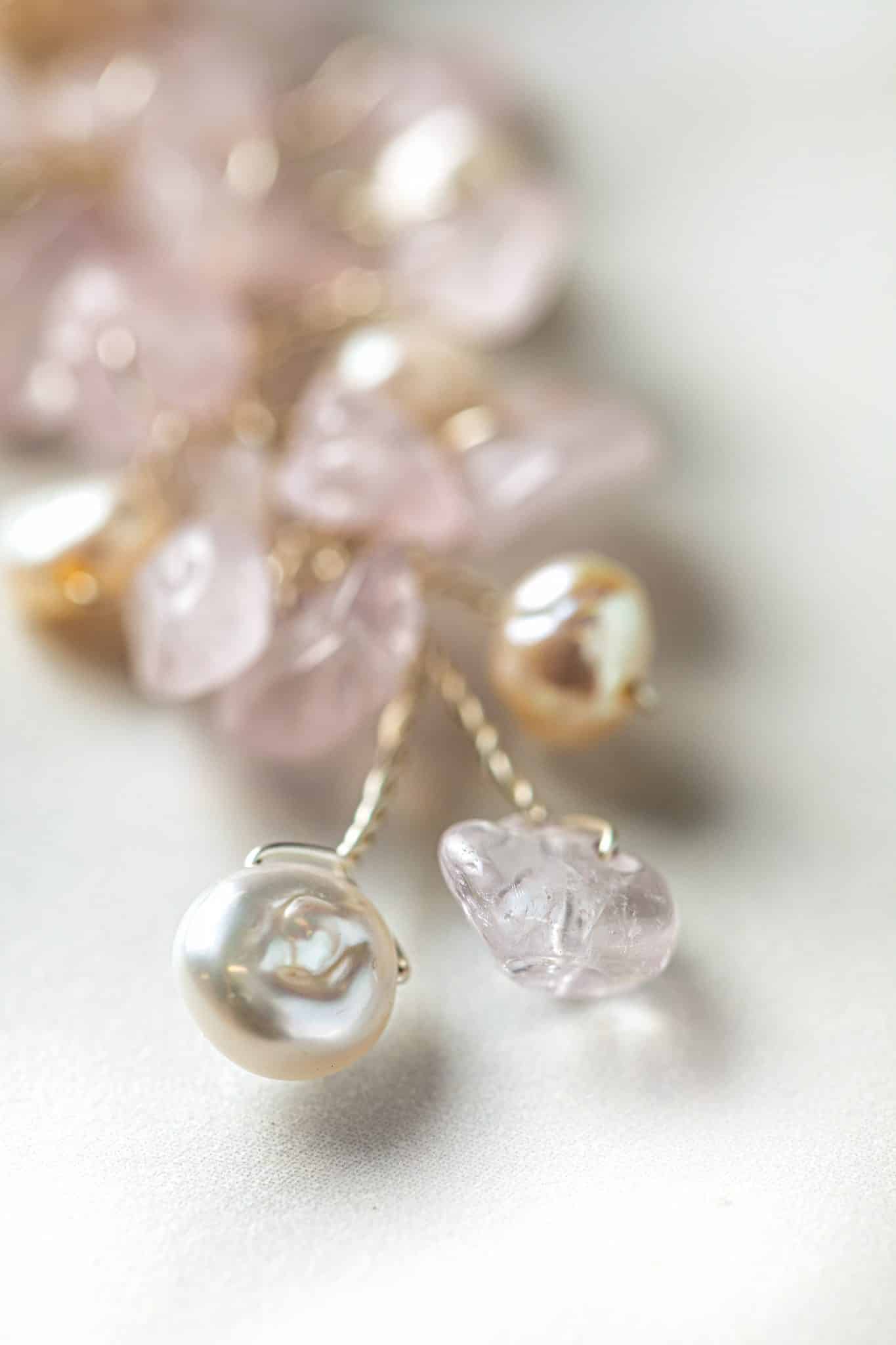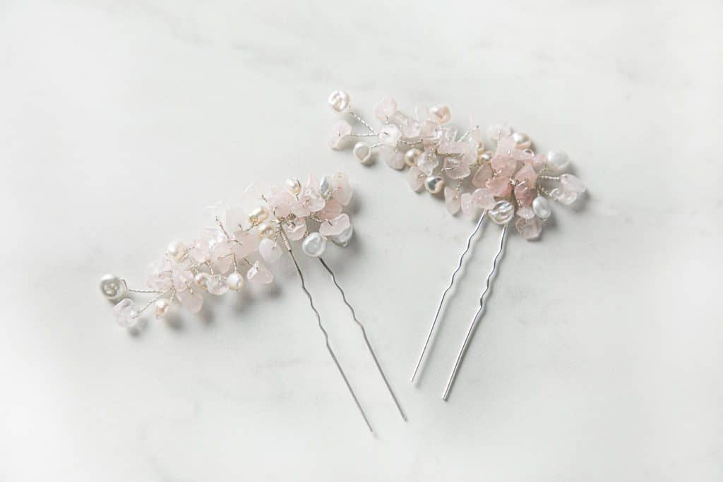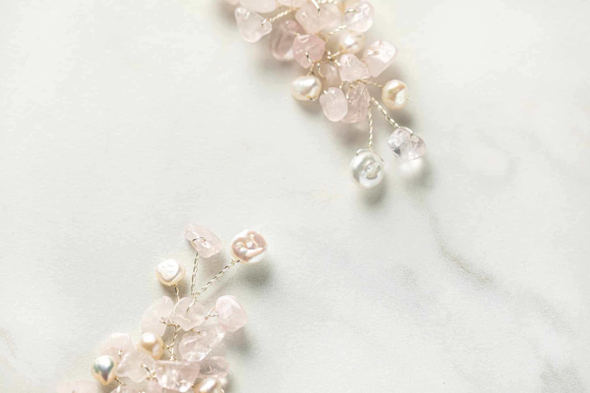 De zachtroze kleur van de edelstenen van de liefde doet denken aan de momenten voordat de zon s’avonds de zee in zakt, wanneer de lucht prachtig roze kleurt. Deze unieke “lovestone” accessoires geven je bruidskapsel een elegante bohemian touch.