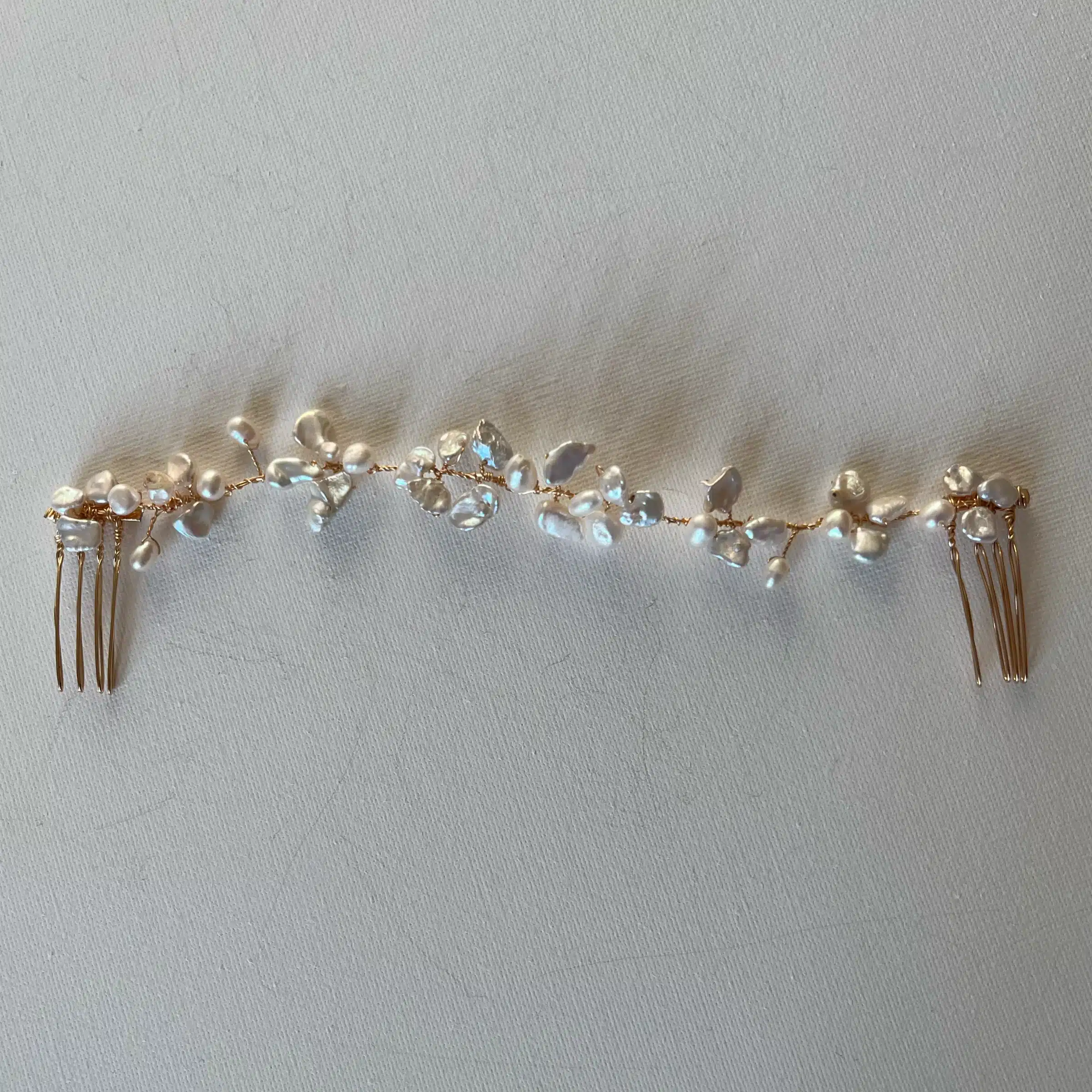 Deze verfijnde haaraccessoire, onze Nova Hairvine, combineert de charme van natuurlijke ruwe parels met de zachte glans van zoetwaterparels. Speciaal voor een unieke, romantische uitstraling die jouw bruidskapsel compleet maakt. Lengte: 18cm