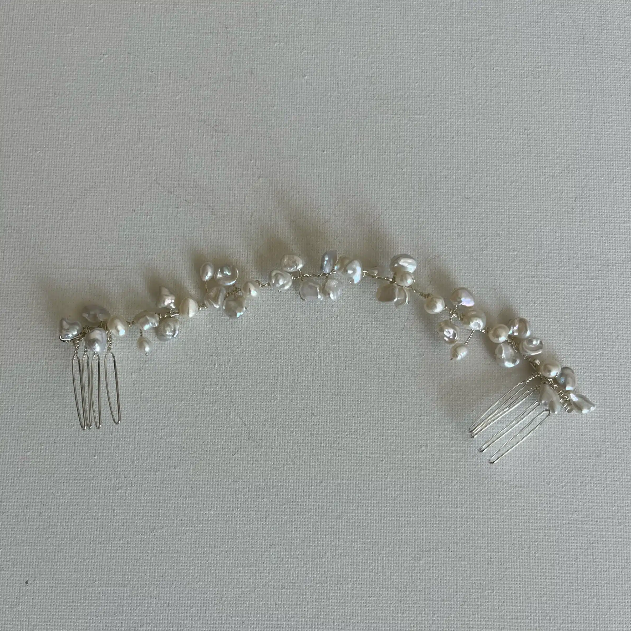 Deze verfijnde haaraccessoire, onze Nova Hairvine, combineert de charme van natuurlijke ruwe parels met de zachte glans van zoetwaterparels. Speciaal voor een unieke, romantische uitstraling die jouw bruidskapsel compleet maakt. Lengte: 18cm