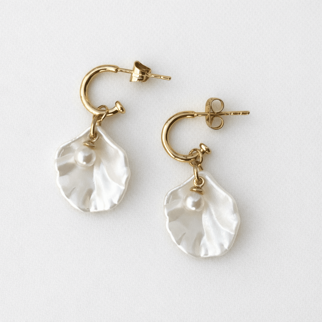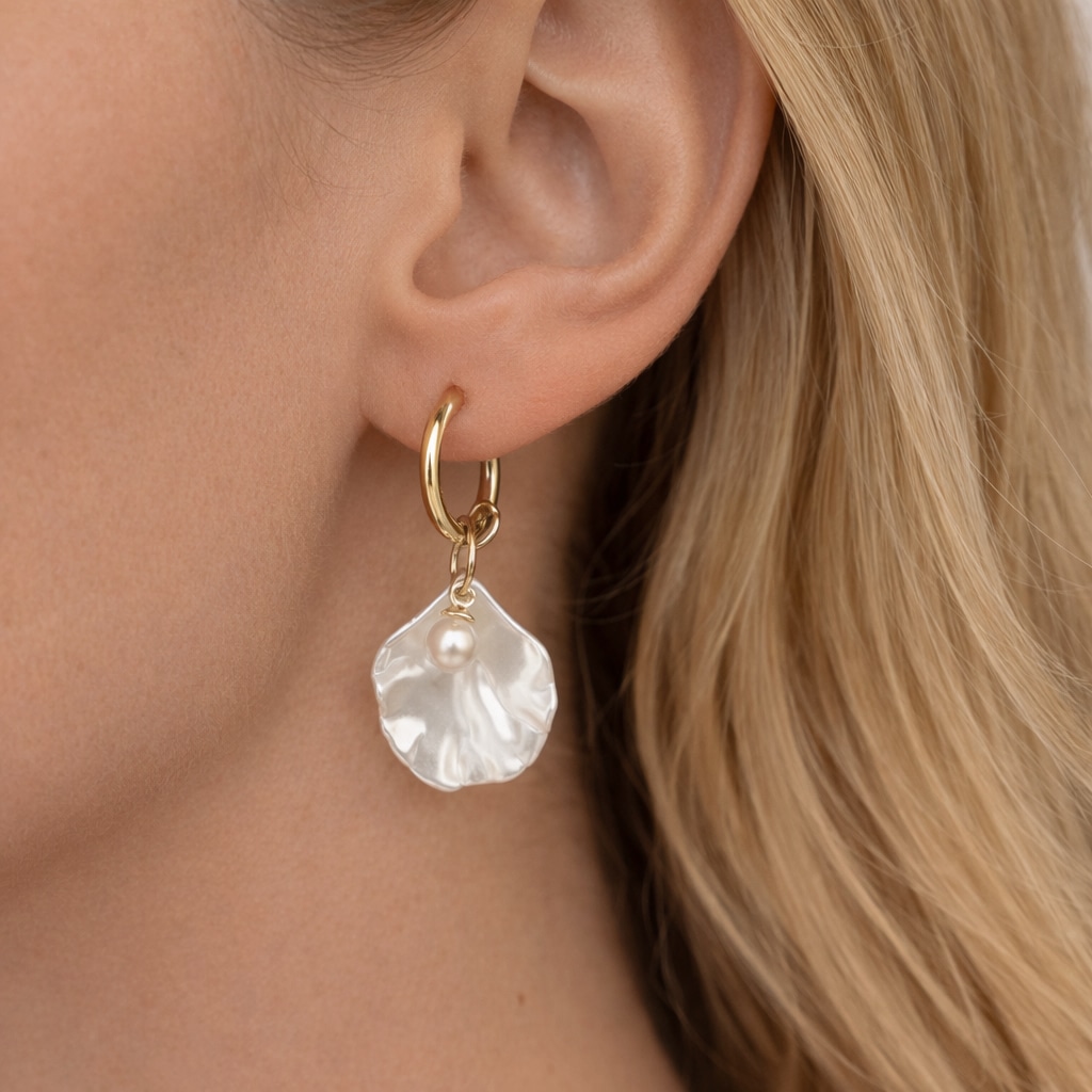 De Shell Earrings Gold hebben een zachte, organische vorm die doet denken aan een verfijnde schelp. De parelmoerachtige glans in combinatie met het warme goud geeft deze oorbellen een romantische en tijdloze uitstraling.