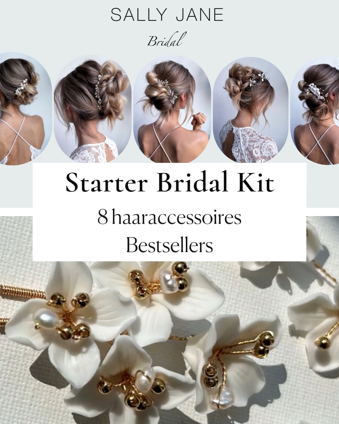 Begin je bruidsstyling avontuur met de zorgvuldig samengestelde Starter Bridal Kit van SallyJanebridal. Deze kit bevat 8 van de populairste haaraccessoires, perfect om jouw bruidskapsels te creëren.