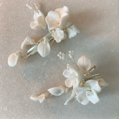De Vanessa Hairclips (set van 2) van SallyJaneBridal zijn gemaakt van keramische subtiele bloemetjes en afgewerkt met kleine blaadjes. De haarsieraden hebben een bohemian uitstraling en staan door de fijne afwerking heel subtiel in het kapsel.